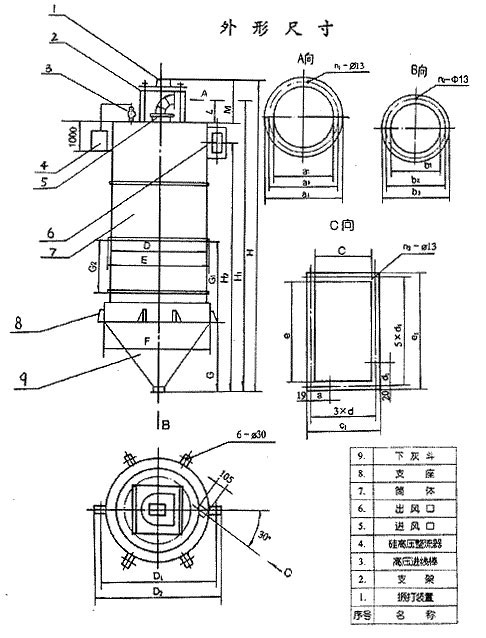 含塵氣體從設(shè)備頂部進(jìn)風(fēng)口進(jìn)入設(shè)備后,以高速經(jīng)過旋風(fēng)分離器,使含塵氣體沿軸線調(diào)整螺旋向下旋轉(zhuǎn),利用離心力,除掉較粗顆粒的粉塵,有效地控制了進(jìn)入電場的初始含塵濃度。然后,氣體經(jīng)下灰斗進(jìn)入電場工作,由于下灰斗截面積大于內(nèi)管截積數(shù)倍,根據(jù)旋轉(zhuǎn)矩不變原理,徑向風(fēng)速和軸向風(fēng)速急劇降低產(chǎn)生零速界面而使內(nèi)管中的重顆粒粉塵沉降于下灰斗內(nèi),降低了進(jìn)入電場的粉塵濃度,低濃度含塵氣體經(jīng)電收塵而凝聚在陰陽極板上,經(jīng)清灰振打而將收集的粉塵由鎖風(fēng)排灰裝置輸送走。為了防止內(nèi)管旋風(fēng)和電場極板振打后在下灰斗內(nèi)形成的二次揚塵,特在下灰斗中設(shè)置了隔離錐。
